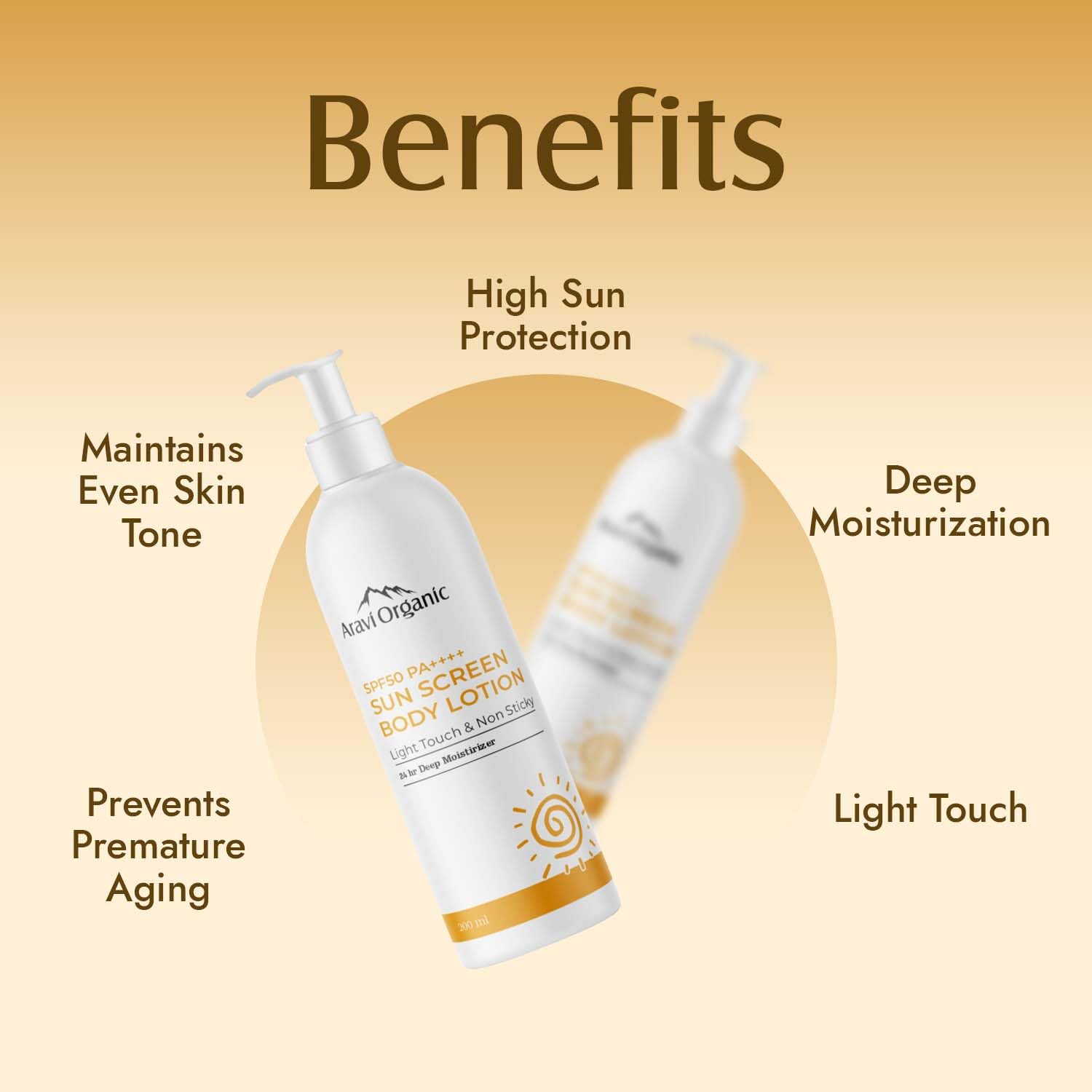 SPF 50 PA++++ BROAD-SPECTRUM PROTECTION: Aravi Organic Sunscreen Body Lotion provides high-level protection with SPF 50 PA++++, effectively shielding your skin from both UVA and UVB rays. This superior sun protection helps prevent sunburn, premature aging, and long-term skin damage, making it essential for daily sun care.