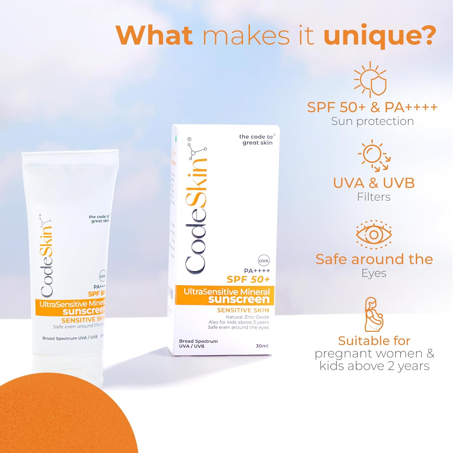 CodeSkin UltraSensitive Mineral Sunscreen SPF 50+ PA++++ | For Sensitive Skin | Sweat/water resisitant| For Men, Women & Kids | No White Cast | Fragrance-Free