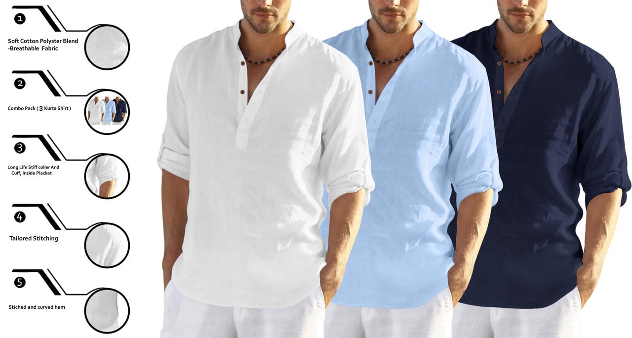 FINIVO FASHION Men’s Cotton Blend Regular Fit Full Sleeve Solid Straight Short Kurta Shirt, Combo Pack of 3