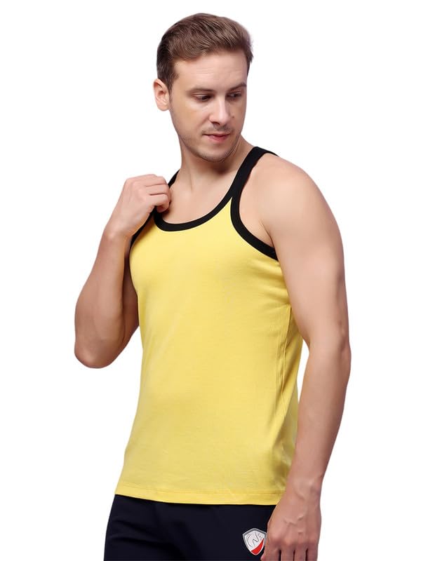 Black Red solid ribbed Cotton gym vests, has a round neck, and sleeveless