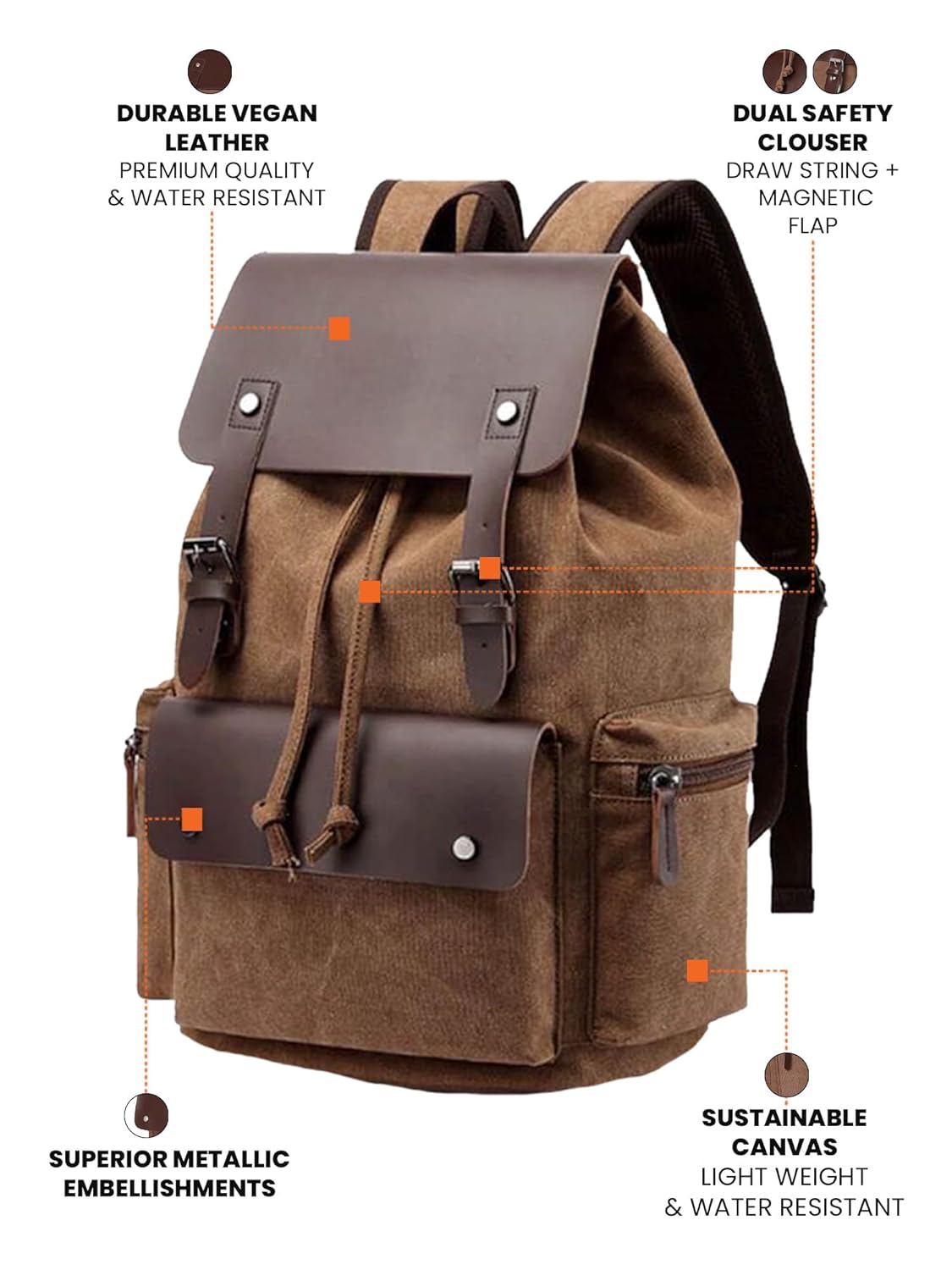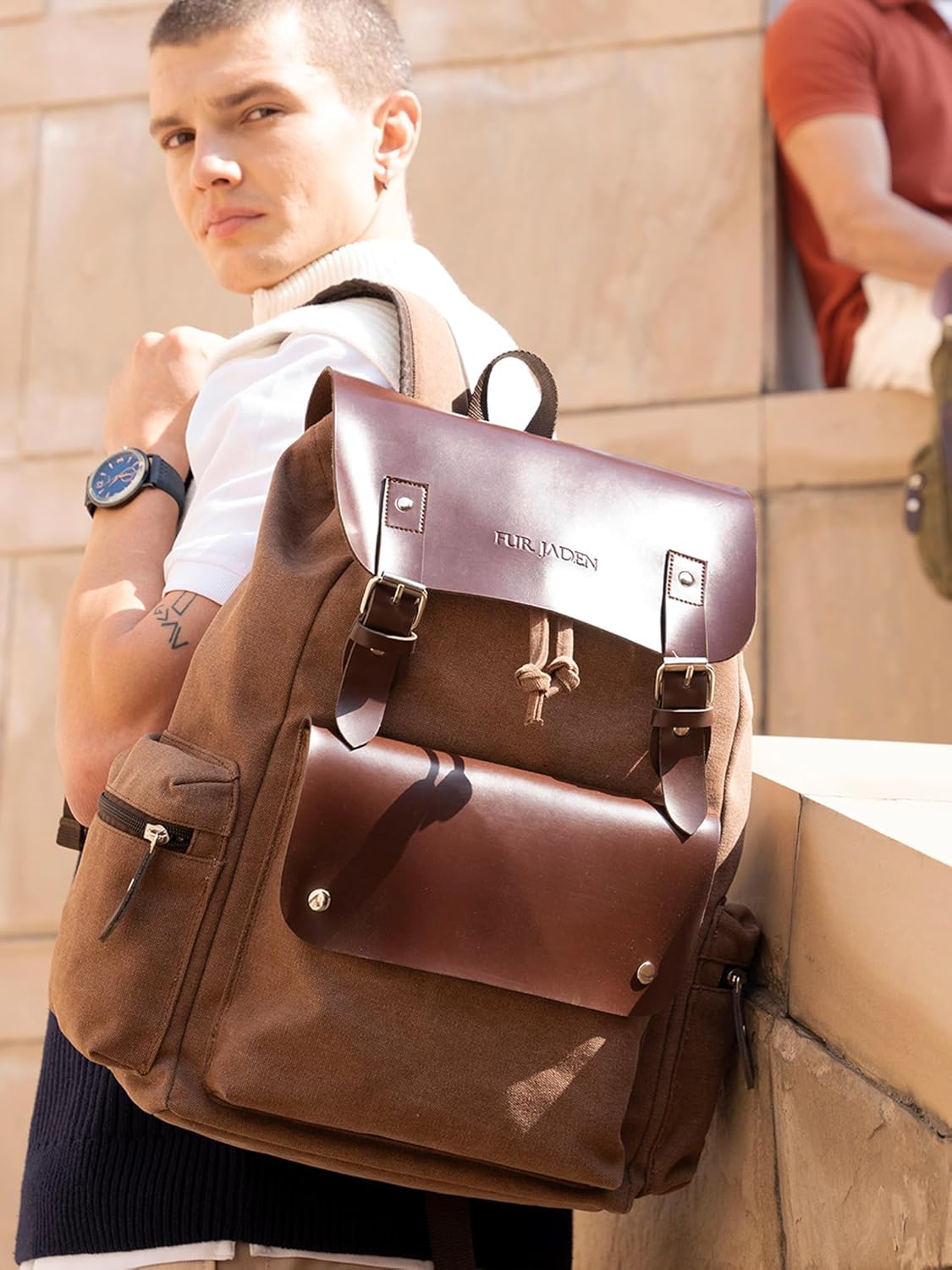 FUR JADEN Eco Friendly Travel Laptop Backpack Made of Water Resistant Sustainable Canvas and Vegan Leather for Men and Women for Travel Hiking Work