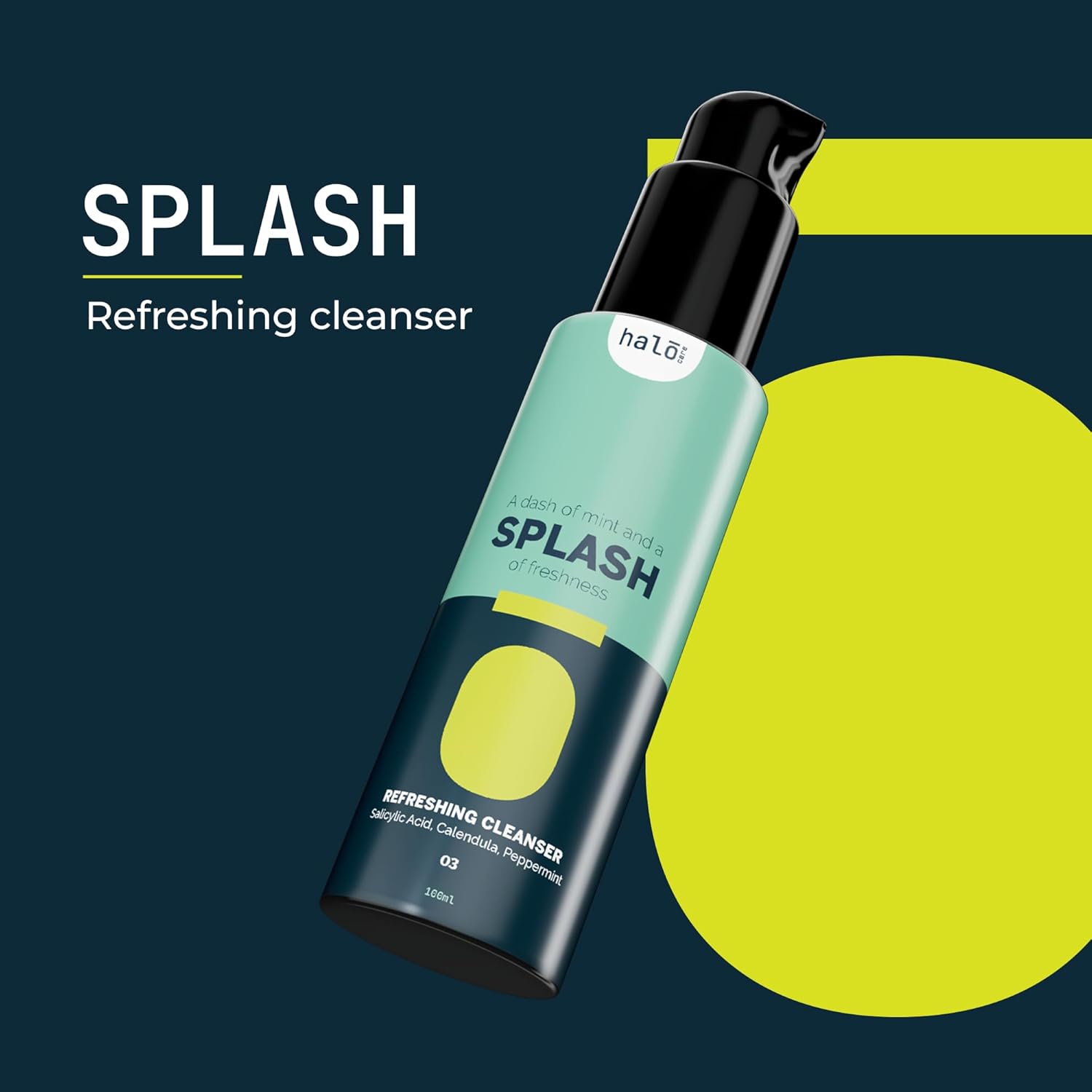 Halo Care Splash Face & Scalp Wash For Men (100 mL) | Low pH, Oil Control, Anti Acne & Cooling | Salicylic Acid (1%), Calendula, Peppermint & Vitamin E, BHA | Shaved & Sensitive Skin Friendly