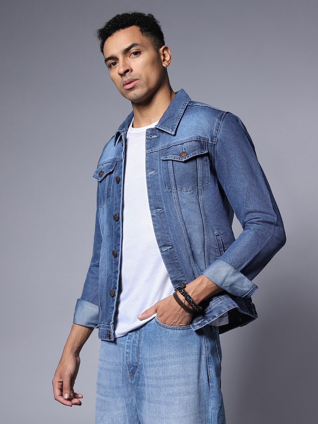 High Star solid denim jacket, has a spread collar, 4 pockets, button closure, long sleeves, straight hem