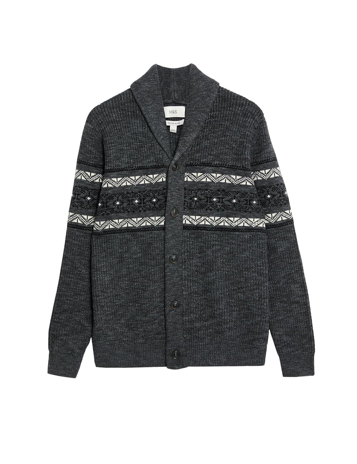 Stay snug in style with this cotton-blend Fair Isle cardigan. The design features the traditional pattern across the chest and a plain textured knit on the lower half. Close-fitting ribbing at hem and cuffs. It’s perfect for layering, with a stylish shawl collar that complements your top underneath. M&S Collection: easy-to-wear wardrobe staples that combine classic and contemporary styles.