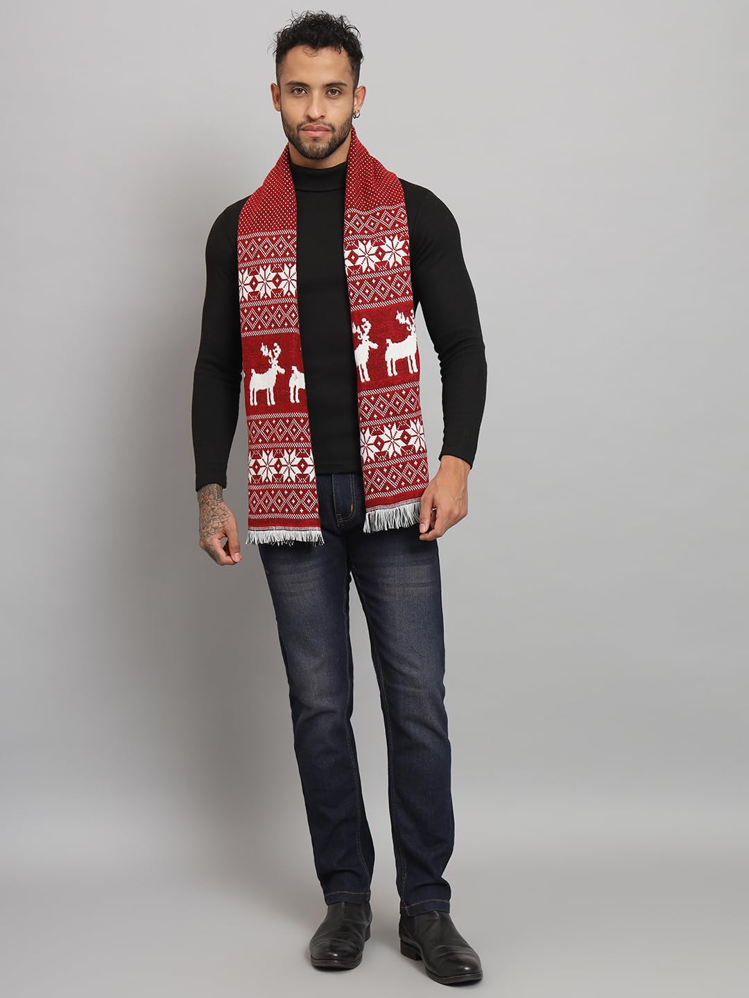 Design & Appearance:Deer Pattern: The scarf features an intricate deer pattern, adding a rustic charm suitable for outdoor enthusiasts and those who appreciate classic, nature-inspired designs.Reversible Design: With contrasting sides, the scarf offers two looks in one. You can easily switch between the two patterns to match different outfits. Material & Fabric:Pure Wool: Made from 100% wool, this scarf provides natural warmth and comfort. Wool’s excellent insulation and moisture-wicking properties make it ideal for colder temperatures.Soft and Lightweight: Despite its warmth, the wool is breathable and gentle on the skin, ensuring comfort throughout the day. Size & Dimensions:Standard Length (72×12 Inches): This size is perfect for wrapping around the neck multiple times or letting it drape elegantly over a coat or sweater. Versatility & Usage:Winter-Ready: This scarf is designed to provide warmth without feeling bulky, making it suitable for both everyday and outdoor wear in cold weather.Multiple Styling Options: Its length allows for versatile styling, whether wrapped snugly around the neck or left loose for a more relaxed look. Styling Ideas:Simple Drape: Drape the scarf evenly over both shoulders to highlight the deer pattern on either side.Classic Wrap: Wrap the scarf around your neck for added warmth, letting the ends hang to display the reversible pattern.Double Loop: For extra coziness, loop the scarf around your neck twice, creating a snug look ideal for colder days.