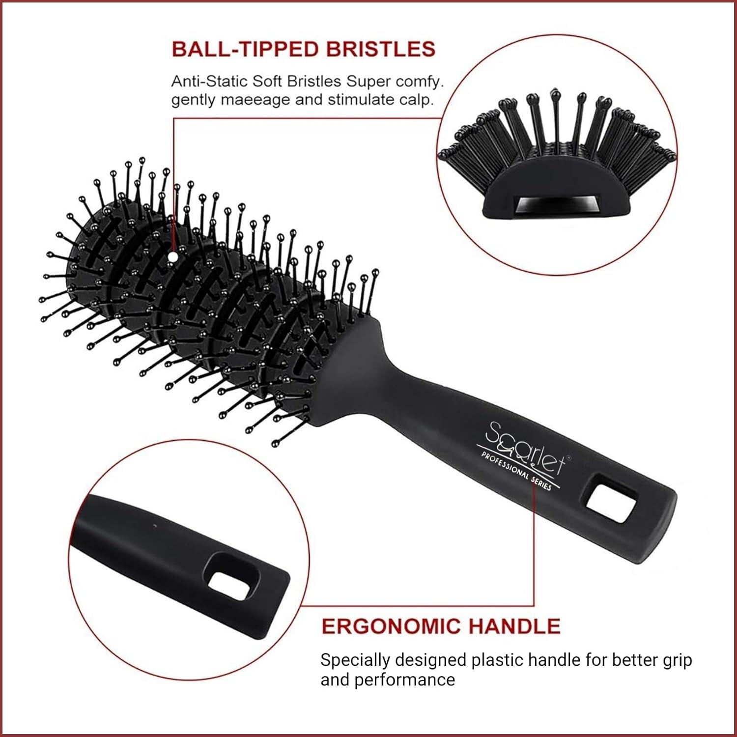Scarlet Line Professional 11 Rows Curved Shape Ball Tip Bristles Medium Vented Flat Hair Styling Brush with Plastic Handle Ideal For Men n Women_Black