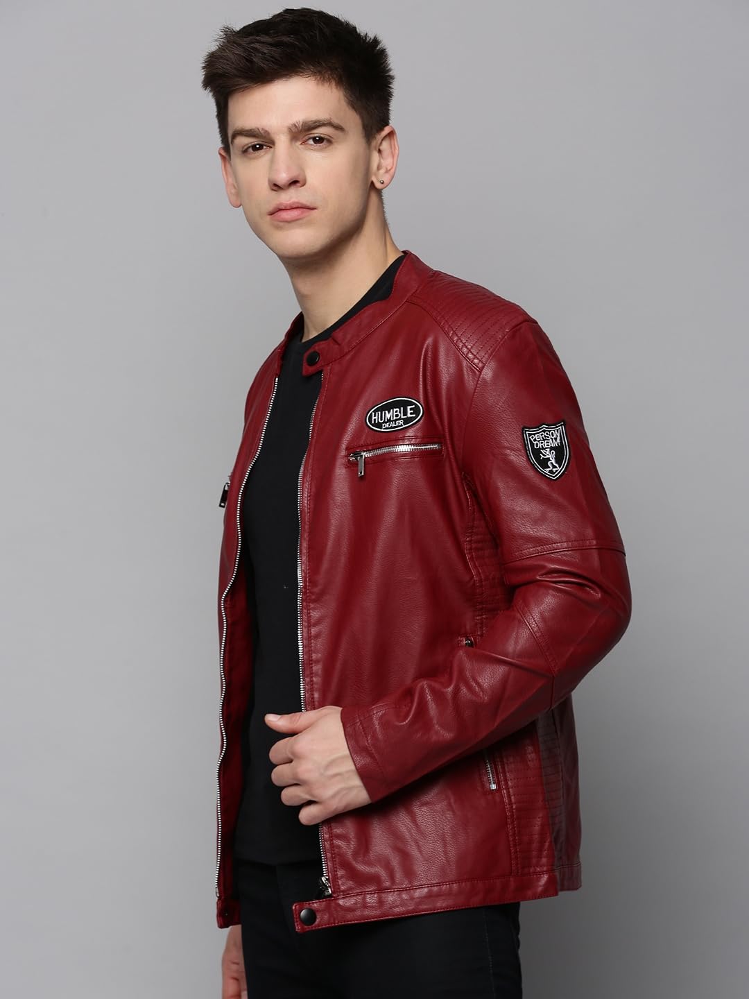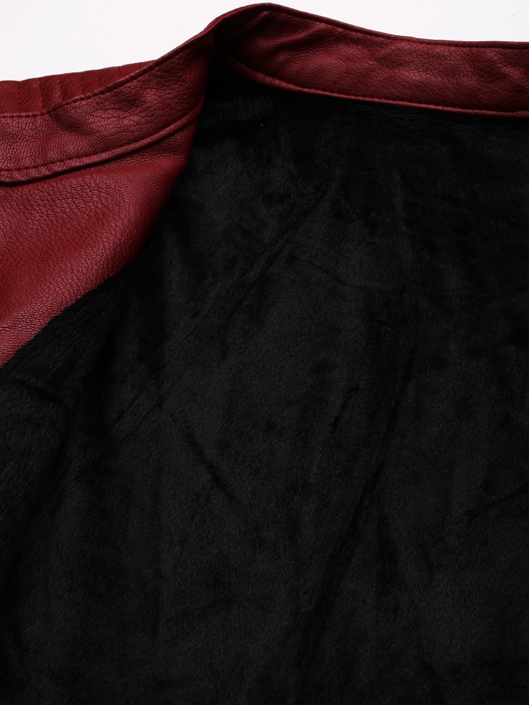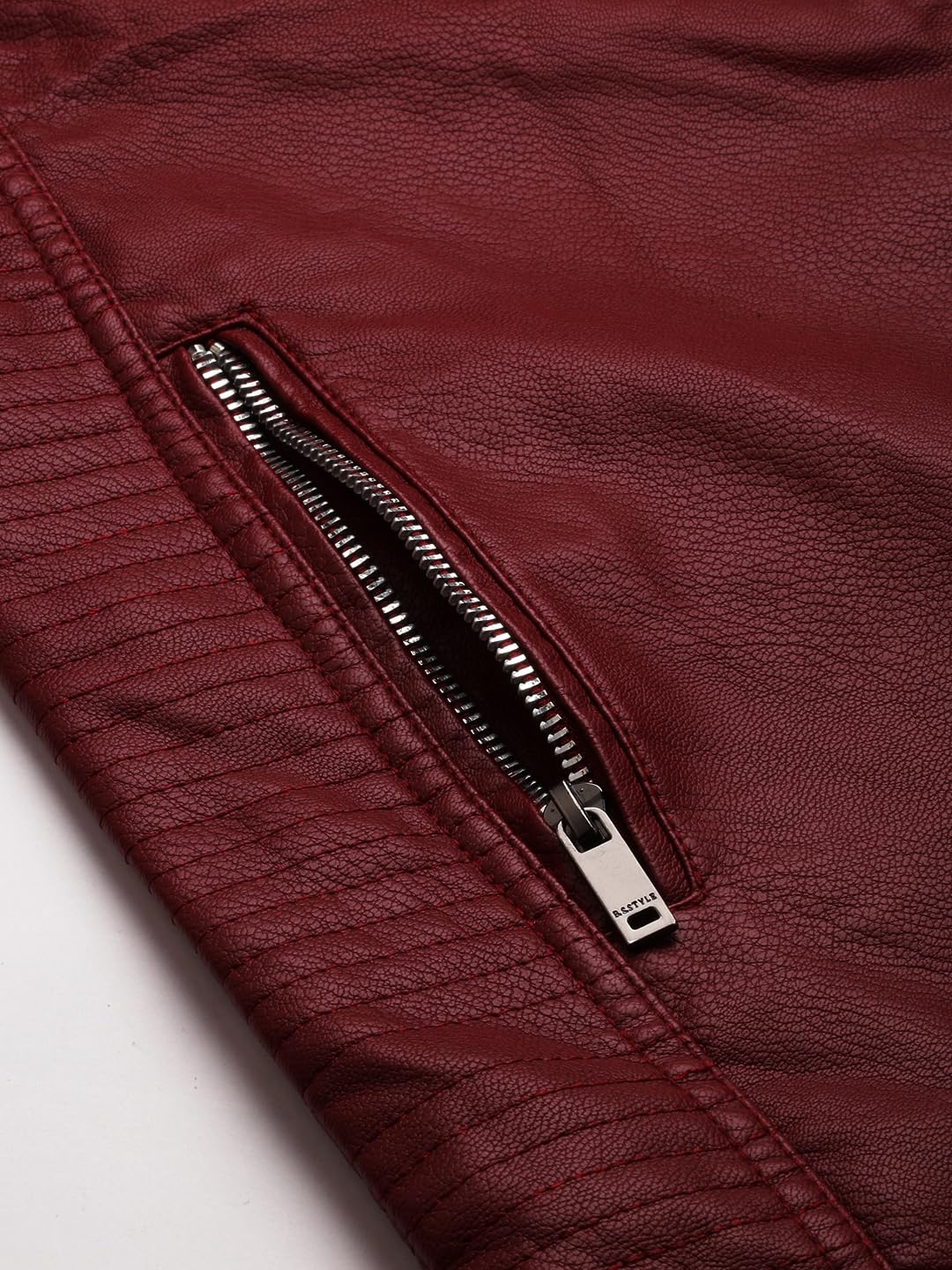 SHOWOFF Men’s Mandarin Collar Maroon Solid Leather Jacket-1928_Maroon