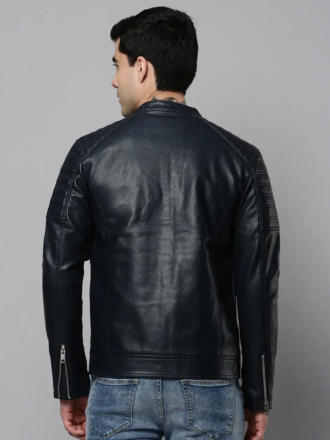 SHOWOFF Men’s Mandarin Collar Navy Blue Solid Leather Jacket-9905A_NavyBlue