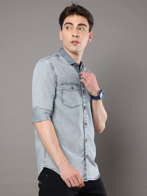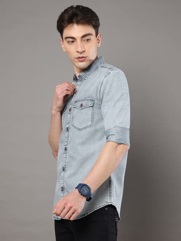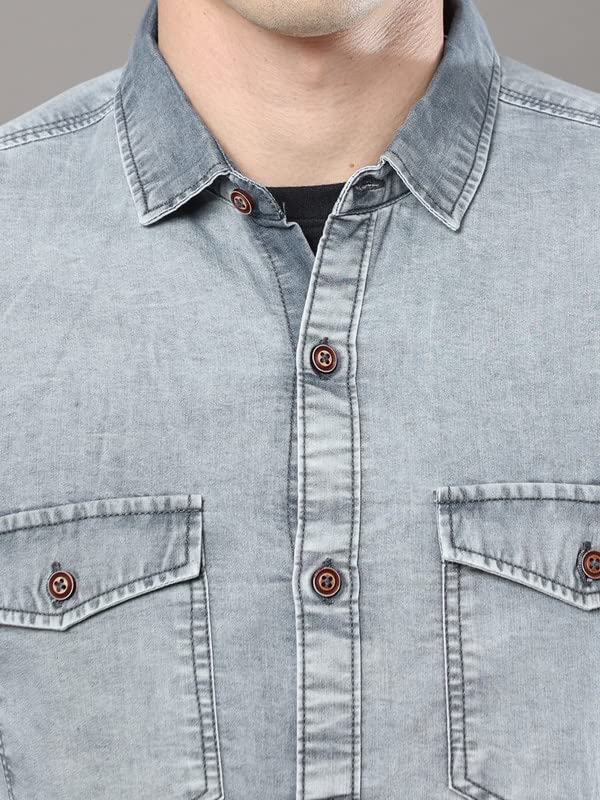 STREETKING Street King Men Grey Light Denim Double Pocket Casual Regular Fit Full Sleeves Shirt XL – Size
