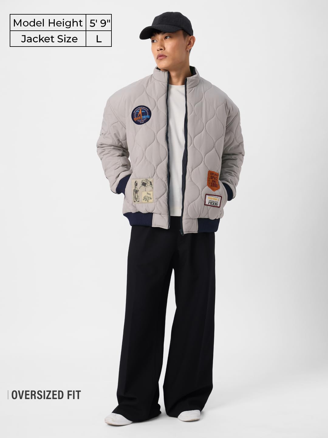 The Souled Store ISRO: Chandrayaan 3 Men and Boys Long Sleeves Stand Collar Zipper Front Grey Embellished Polyester Oversized Bomber Jackets