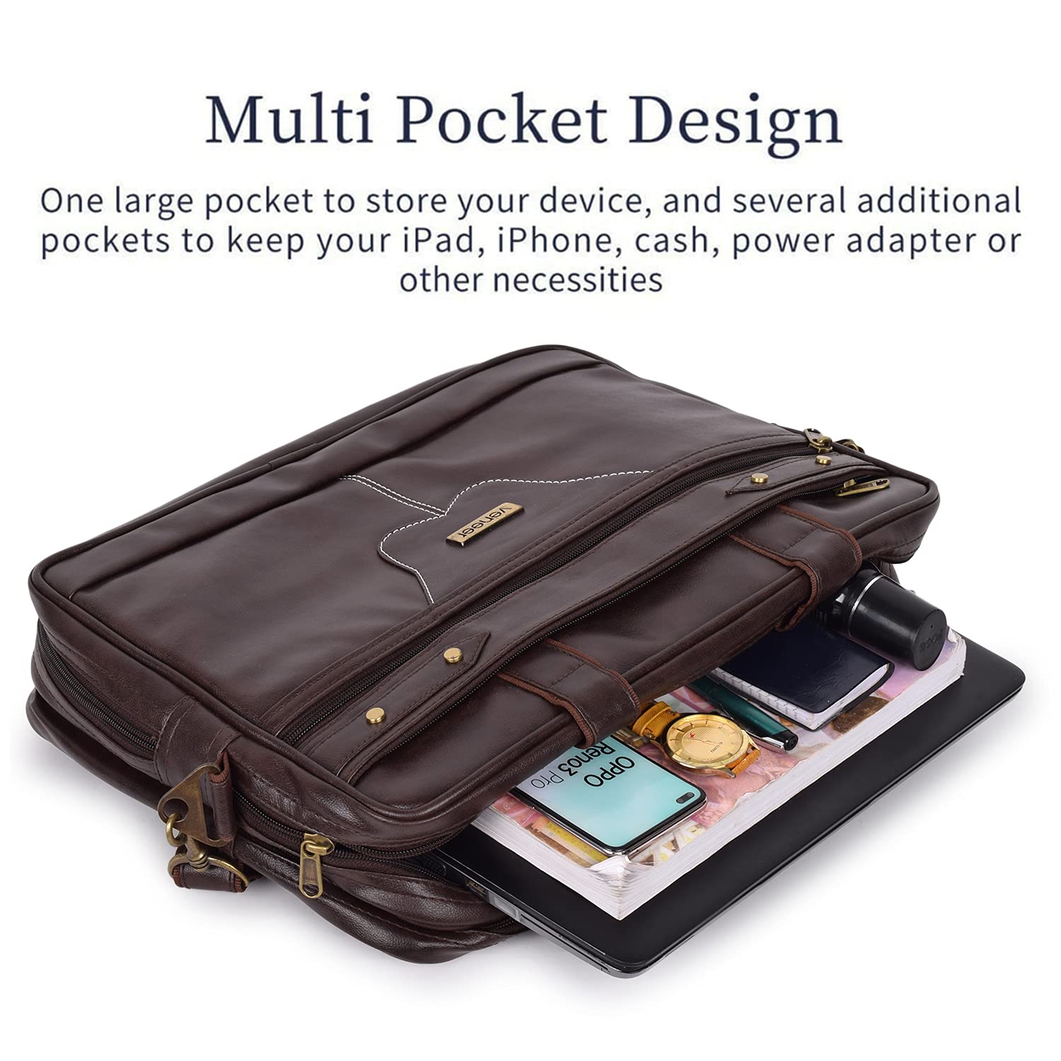 Veneer Men’s 15.6 Inch Waterproof Synthetic Leather Computer Laptop Messenger Bag Briefcase Satchel Shoulder Bag (Brown, Large)
