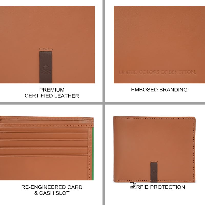 United Colors of Benetton Men RFID Protected Derwent Slimfold Wallet – Tan+Brown, No. of Card Slot: 8 | Tape Inlayed Slimfold Wallet with Side Closure | Leather